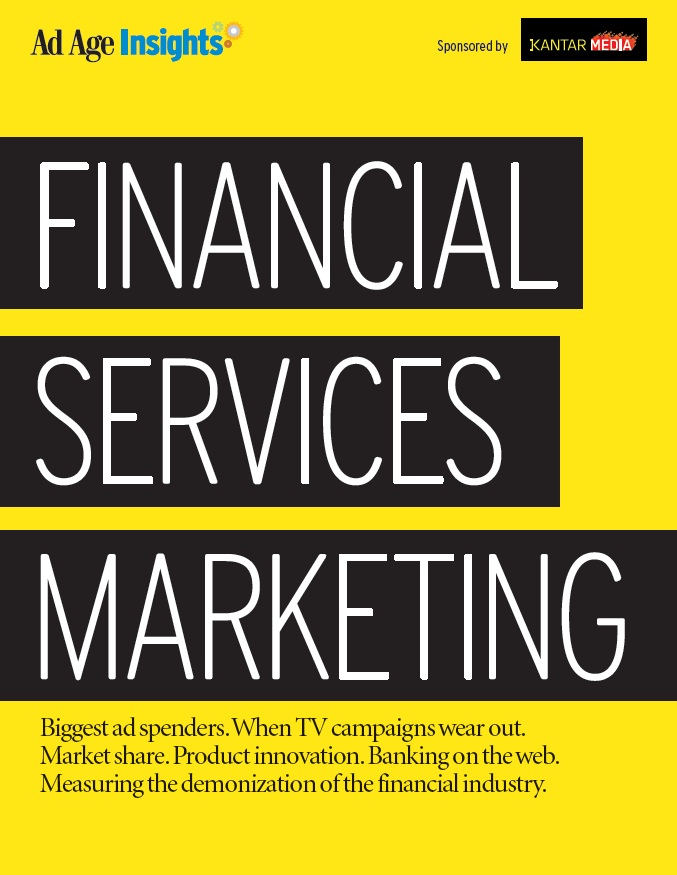 Financial Services WhitepaperPublished in Ad Age, this whitepaper is a data-rich look at the state of financial services marketing; it draws upon figures from Kantar Media Intelligence, Audiences, CMAG, and Compete. Did anyone really expect that in 2011 insurance companies as a category would spend more on U.S. measured media than the nation's banks and credit-card companies -- combined? That 70% of consumers would trust online services enough to conduct banking transactions, and use smartphones to deposit checks into a bank account? This report looks at the biggest spenders in the category and market share, as well as the forces that are changing the marketing of financial services.