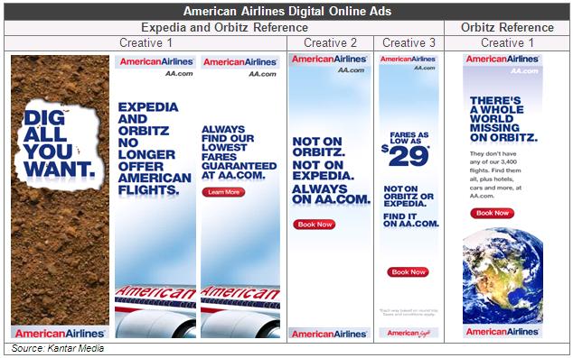 American Airlines responded to Expedia’s de-listing with ads that criticized the suspension of American flights from the online booking site. Their ads also named Orbitz, noting that American flights were no longer available on Orbitz or Expedia. More than seven different online display ads were run in February, 11 in March, and 15 in April, referencing the two travel booking sites’ limitations. After American reached an agreement with Expedia in April, the ads were suspended and they were replaced in May by two new ads that called out solely Orbitz.