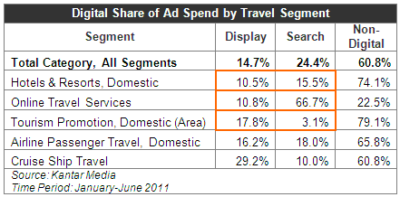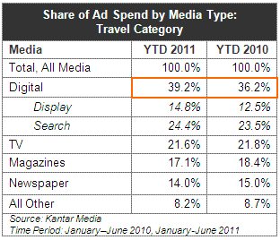 In terms of ad spend share by media, Internet emerges as the key vehicle in the travel sector’s ad strategy, dominating almost 40% of the budget for the January-June 2011 period, an increase from its 2010 share of 36%. Paid search and online display spend accounted for 15% and 24% of total spend respectively, each with an increased share as compared to one year ago. All other media experienced a decrease in share as the proportion of ad budget allocated to Internet advertising increased, with travel companies redirecting more and more ad dollars into search and display categories.