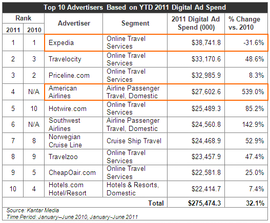 Measured Ad Spend by Travel Advertisers: Who’s Up, Who’s DownThroughout the first half of 2011, Expedia, Travelocity and Priceline remained in the top three rankings for highest Internet advertisers. American Airlines and Southwest Airlines emerged as new members of the top ten group in 2011, jumping to number four and six respectively.