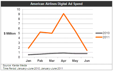 All of the top ten Internet travel advertisers, except for Expedia, increased their digital budget between 2010 and 2011. Expedia’s digital ad spend decreased by almost one-third. In glaring contrast, American Airlines increased its online expenditure by a whopping 539%, with a jump from $4.3 million in the 2010 January-June period to $27.6 million during the same period for 2011. This increase propelled AA’s rise to the number four slot of top Internet advertisers in the travel category, with considerable increases in both search and display ad spend. Such an aggressive ad investment raises the question -- how did American Airlines distribute these dollars across online media?