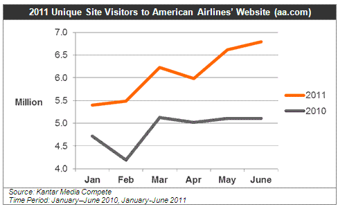 Taking into consideration seasonal travel habits that impact aa.com’s site traffic at any level, we still notice a substantial vertical shift in the site visit trend line as compared to the same period in 2010. With an average of 1.2 million more unique site visitors per month as compared to last year, American’s ad investments were successful in driving traffic to aa.com.