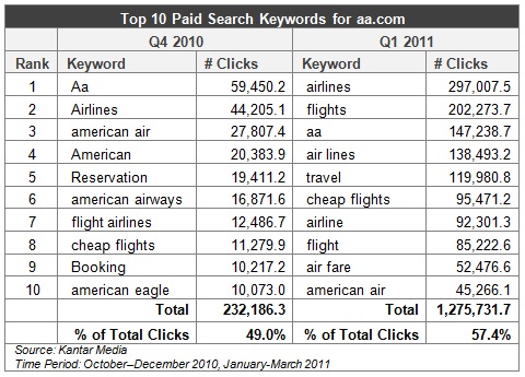 With a considerable increase in paid search advertising, we sought to determine if this change in ad investment impacted the top keywords driving traffic to the aa.com web site. To start, the number of clicks for the top ten keywords were up by 450% in Q1 2011 compared to the previous quarter. Furthermore, there was a considerable difference between the top keywords for Q4 2010 and Q1 2011, both before and after American made its official break with Orbitz and Expedia. During the former period, the American Airlines’ branded name as well as spelling and acronym variants directed the highest traffic to the aa.com website; the top four keywords were all some form of the American branded name. Generic terms like “cheap flights” and “booking” were found lower in the list and received fewer clicks. During the first quarter of 2011, however, the top two keywords that drove traffic to aa.com were the generic terms “airlines” and “flights”. We noticed that the aa.com site received most of its clicks from a general flight search; in other words, Internet search users were not initially seeking out American Airlines flights from the start of their search.