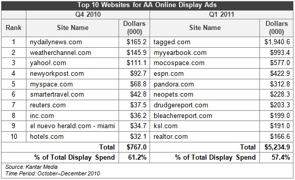 We also saw extensive changes in the list of sites carrying AA display ads between Q4 2010 and Q1 2011. The airline spent more ad dollars with new websites; in fact, the top ten websites for AA ad placements were entirely different between these two quarters. Not only were the sites different, but they were members of entirely different website categories. In Q4 2010, the highest display ad dollars were directed towards newspaper, TV station, and travel website categories. In Q1 2011, the top three site categories for AA display advertising were social networking, general interest/general entertainment, and blogs.