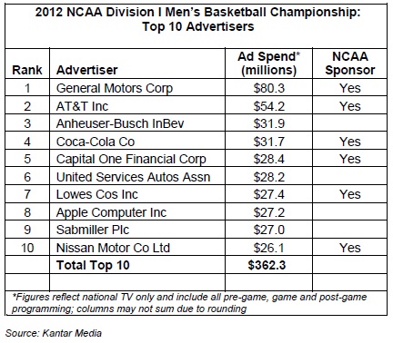 In 2012, the top ten advertisers invested a total of $362.3 million to pitch their messages at NCAA viewers.