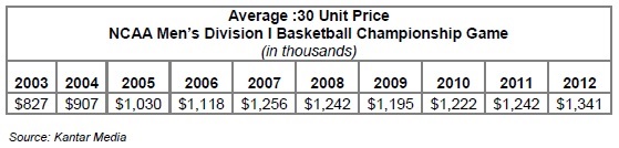 In 2012, the average price of a :30 unit in the championship game was $1.34 million, up 8.0 percent from the prior year.