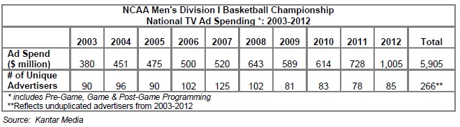 Over the past 10 years (2003-2012), the NCAA men’s basketball tournament has generated more than $5.9 billion of national TV ad spending from 266 different marketers. Ad revenue in 2012 surpassed the $1 billion mark for the first time.