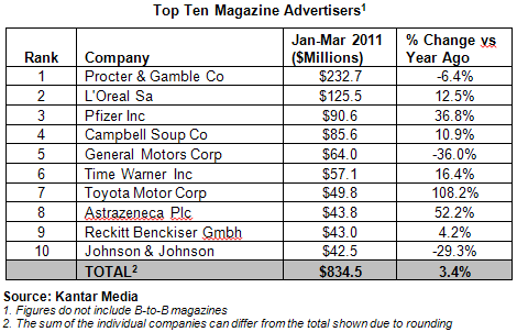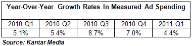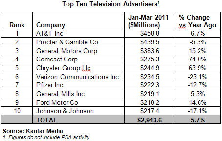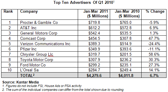 Spending among the ten largest advertisers in the opening quarter of 2011 was $4,279.6 million, a 6.7 percent increase compared to a year ago. Among the Top 100 marketers, a diversified group accounting for close to one-half of all measured ad expenditures, budgets climbed 4.8 percent.