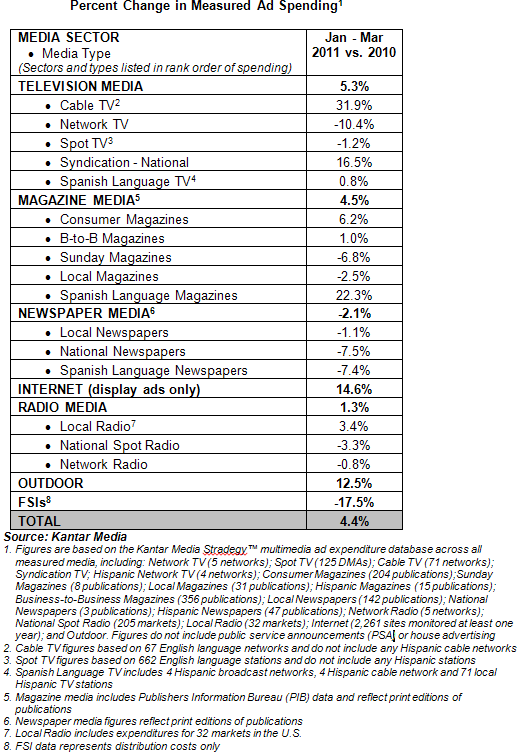 New York, NY, June 13, 2011 – Total advertising expenditures in the first quarter of 2011 increased 4.4 percent from a year ago and finished the period at $32.5 billion, according to data released today by Kantar Media, a leading provider of media research and insights. Although first quarter performance fell below 2010 levels, the ad market has now achieved five consecutive quarters of year-over-year growth.
