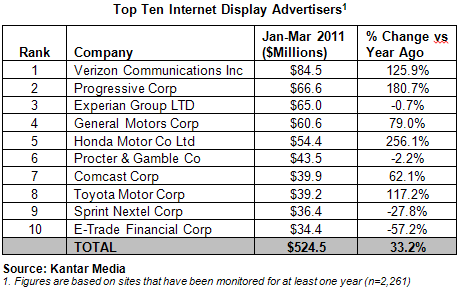 The top ten internet display advertisers of Q1 2011 invested $524.5 million in the medium, an increase of 33.2 percent. As a proportion of total display ad spending by all advertisers, the top ten accounted for 19.7 percent, a larger concentration than either TV or magazines. Auto manufacturers were represented in the ranking with three spots and some of the most dramatic growth rates. Telecom and financial service companies also claimed multiple spots.