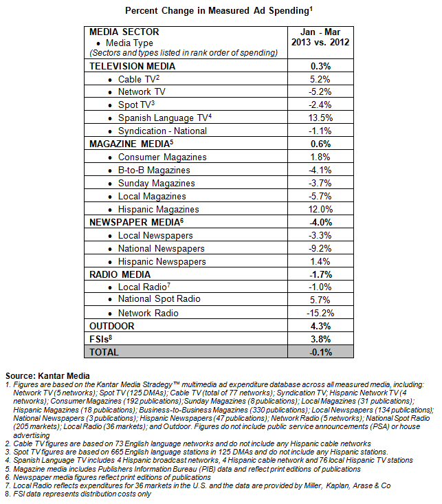 “It has been a lackluster start for 2013, with flat year-over-year results due in part to strong 2012 growth caused by political and Olympic ad spending,” said Jon Swallen, Chief Research Officer at Kantar Media North America. “Data from the early second quarter are mixed, suggesting marketers are still being cautious and conservative with ad budgets. However, there are some bright spots, including healthy growth for Hispanic media and Outdoor.”