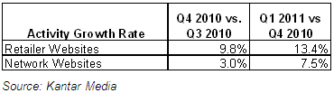 Retailer websites grew at almost double the rate versus the growth recorded for key Network websites tracked by Marx, increasing 13.4 percent and 7.5 percent respectively from Q4 2010 compared to Q1 2011. This continues the trend observed in Q4 2010 versus Q3 2010 where digital coupon events on Retailer websites grew more than three times the rate versus digital coupon events on Network websites, increasing 9.8 percent and 3.0 percent respectively.