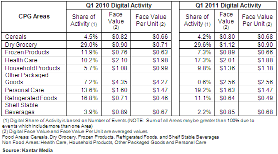 Food Areas represented 54.4 percent of digital coupon events while Non-Food Areas represented 46.9 percent in Q1 2011 (NOTE: Sum of all Areas may be greater than 100% due to events which include more than one Area). Four of the five Food Areas decreased in share of activity. Refrigerated Foods had the greatest decrease, declining 5.7 points from Q1 2010 to Q1 2011. Dry Grocery was the only Food Area to increase with less than a one point increase from Q1 2010 to Q1 2011. Three of the four Non-Food Areas increased share of activity in Q1 2011 compared to Q1 2010. Health Care had the greatest increase followed by Personal Care with increases of 7.1 points and 5.6 points respectively.
